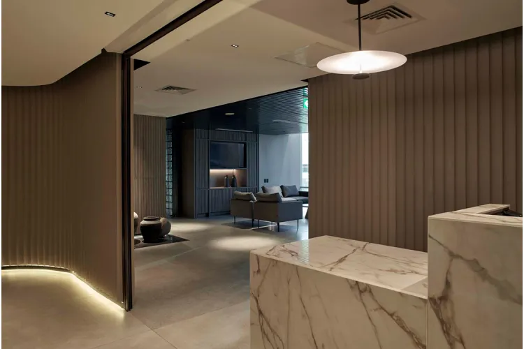 Декоративні панелі великого формату розроблені компанією KRION. Виготовлені з інноваційного матеріалу Fitwall, який складається з тригідроксиду алюмінію (ATH), поліефірної смоли з переробленим PET, скловолокна та натуральних пігментів. Завдяки цим компонентам Fitwall поєднує реалістичні текстури з високими експлуатаційними властивостями.